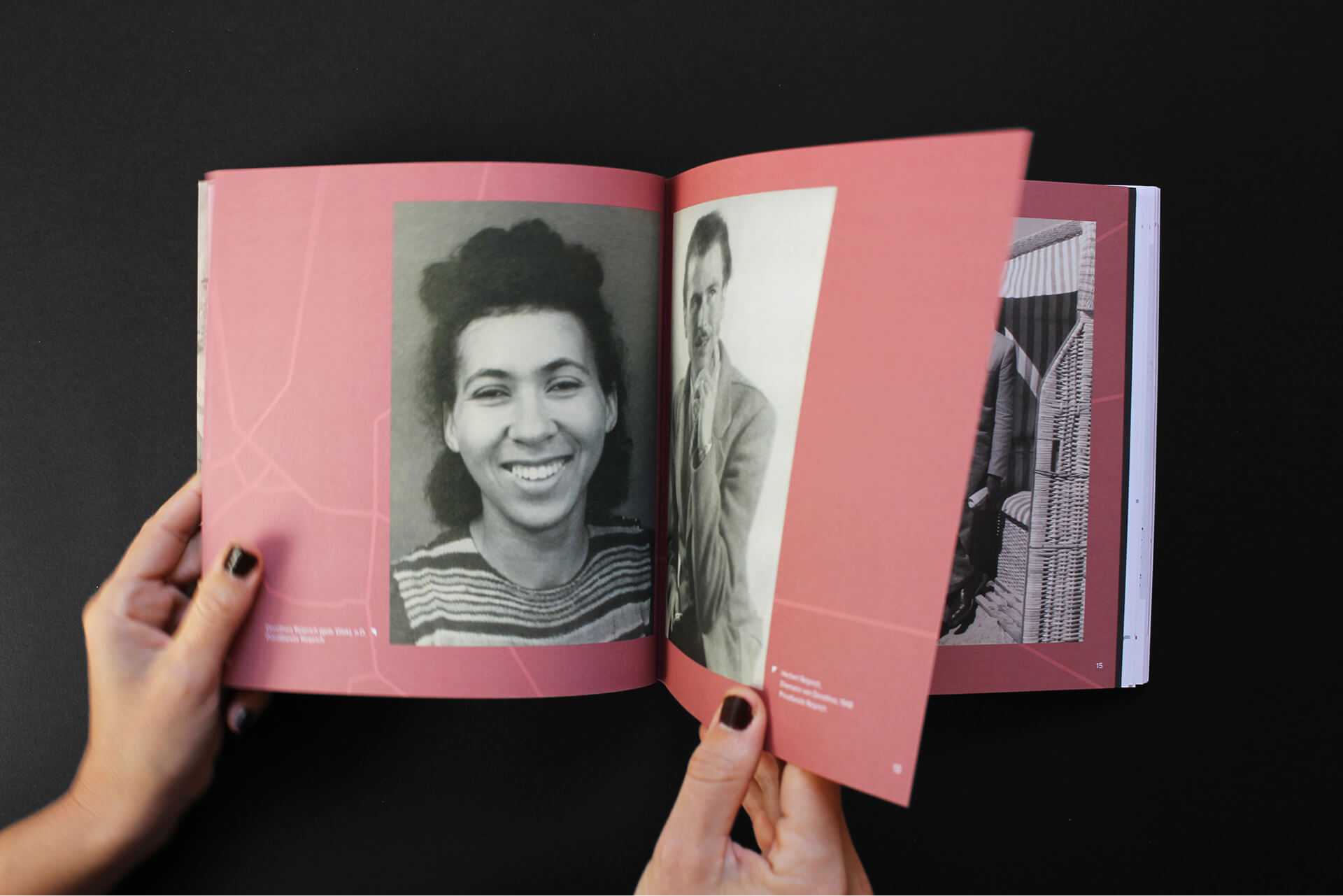 As with the exhibition’s communication materials previously designed by us, the book is built on the visual concept developed by Kollektiv >>kaboom<<, based on the lines of a city map. We carried this visual language forward to ensure continuity across all formats. These lines run throughout the publication, structuring the content, connecting stories, and guiding the reader through the historical narrative. The cover follows the established visual language of the project, featuring the exhibition’s key image.